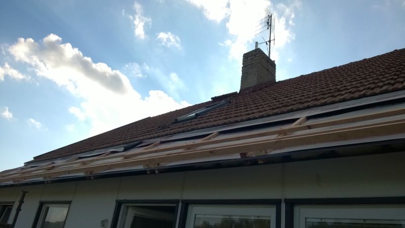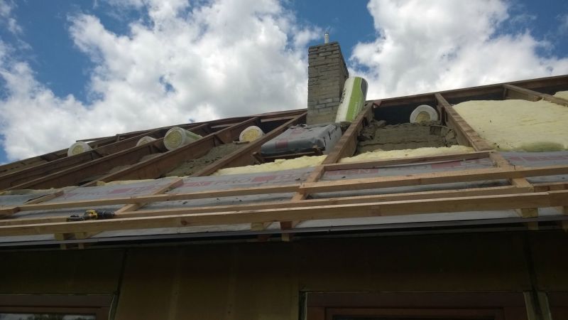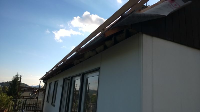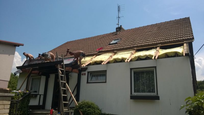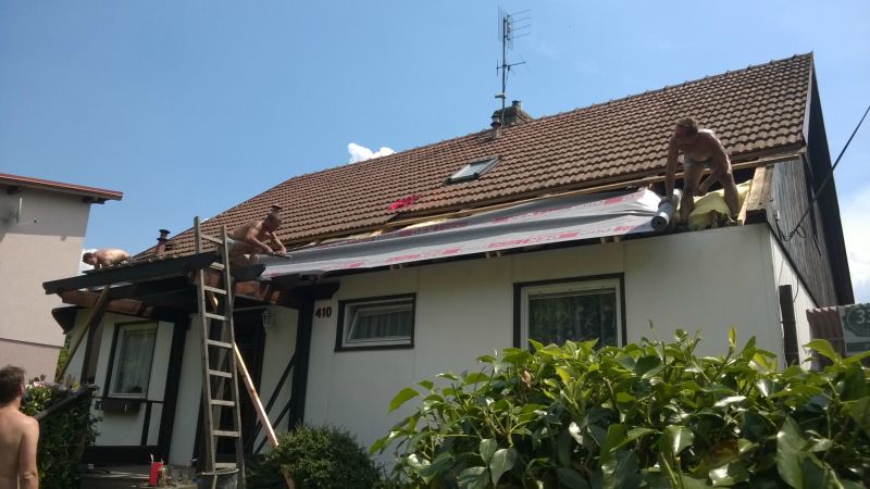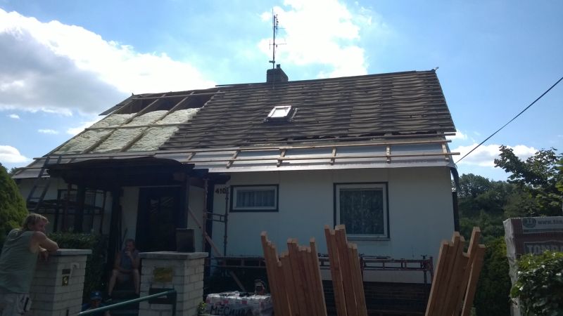 Likvidace staré krytiny, zateplení podstřeší vatou, zafoliování, latování, polození nových tašek a zhotovení pohledů včetně světel.