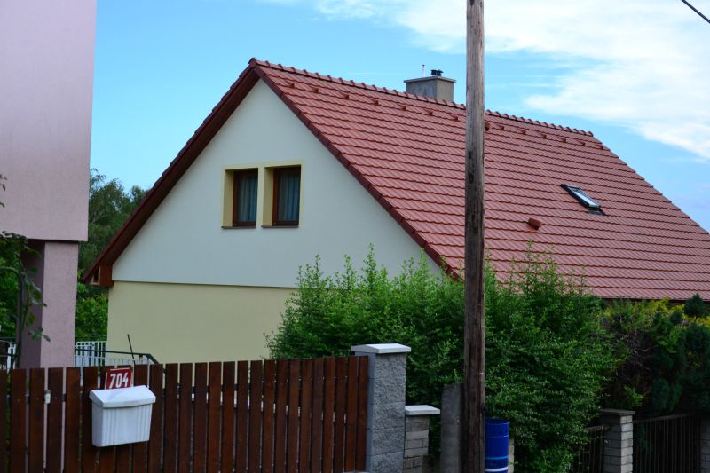 Likvidace staré krytiny, zateplení podstřeší vatou, zafoliování, latování, polození nových tašek a zhotovení pohledů včetně světel.